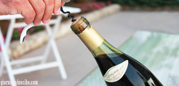 Il tappo di una delle due bottiglie all’apertura, dopo tanti a contatto con il liquido, anche se tiarato su in modo estremamente delicato si spezza. Versato il vino nel bicchiere dopo averlo accuratamente filtrato, sarà proprio questa bottiglia a dare i risultati più pregevoli, è necessario attendere una decina di minuti affinchè possa mandar via i sentori olfattivi spuri e liberare le sue note.