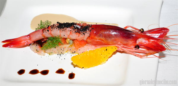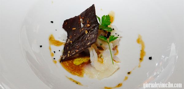 “Scicchissimo” il gamberone rosso su un battuto dello stesso agli agrumi con maionese di bottarga, pomodorino candito olio al mandarino, a guarnire il finocchietto ed una spolverata di carbone di nero di seppia. C’è “tutta la Sicilia nel piatto”, bellissimo da vedere, sublime da assaggiare, freschezza e suadenza, persistenza e aromaticità.