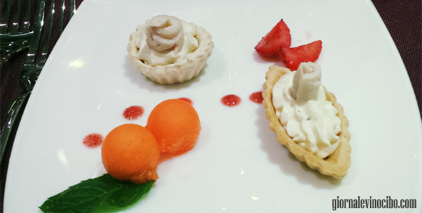 Il menù della serata ha sciorinato: Tartelletta con mousse di philadephia, riduzione di fragole e spada marinato al pepe arlecchino in abbinamento al Grillo 2012
