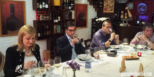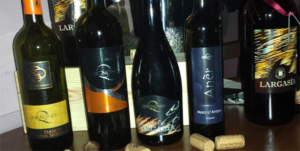 I vini Quignones in abbinamento ai piatti di Peppe Bonsignore: da sx il Castel San Giacomo bianco ’13, l’Insolia Quignones ’13, Il Largasia Fiano ’13, il Passito di Nero d’Avola ’12 e la magnum di Largasia rosso ’04