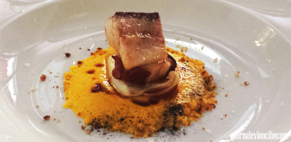 Inebriante questo piatto composto da una piccola piramide costituita dalla seppia, il polpo cotto nel tè verde e saltato in padella e profumato al timo e il sugarello, il tutto adagiato su una crema di carota di ispica e riduzione di salsa di soia ottenuta dalla cottura dei pesci.