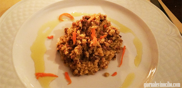 Il piatto che più mi è piaciuto è il grano spezzato con ragù d’asina con grattuggiatina di carote sbollentate che danno tendenza dolce al piatto e riequilibrano la sapidità del ragù. Piacevolissimo.