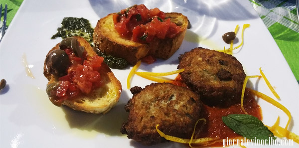 Le polpette di sarde con la ricotta, accompagnate da bruschette con pomodori e capperi del ristorante Silos