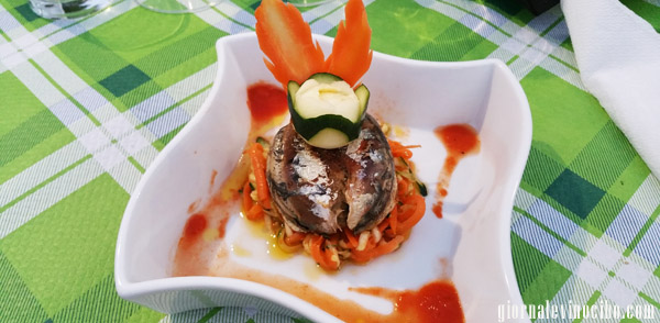 Il tortino di alici con melanzana, capperi, olive su insalatina di verdure e salsa al Gaspacho del ristorante Sottovento