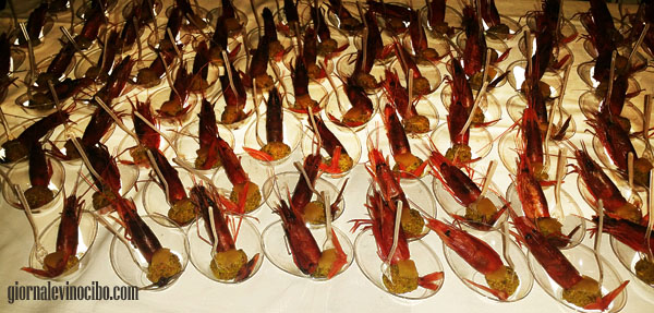Splendidi abbinamemti di fingerfood sono stati realizzati dallo chef Carlo Sichel de Il Carato di Catania, una semplice ma efficace perla di datterino rosso e crema di mozzarella di bufala, una deliziosa zuppetta fredda di melone e insalata di polpo, ed un elaborato cubetto profumato di menta e zenzero con il gambero rosso di Mazara. In chiusura la pasta, mezzemaniche al pesto di finocchietto marino, ricci di mare e profumo di liquirizia.