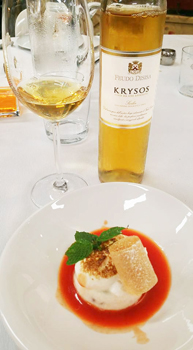 5- Chiusura con la zuppa di fichi d’India con crema bruciata di cassata, ultimo incanto da degustare che sancisce lo straordinario viaggio di sensazioni, in abbinamento con la vendemmia tardiva di Grillo Krysos 2008 Feudo Disisa, una visione dolce dell’uva grillo in un vino con 120gr di zucchero residuo, compagno ideale di un elegante dessert.