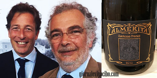 Contessa Franca Brut 2010 Tasca D’Almerita (Pa), questo nuovo spumante è un 60 mesi sui lieviti, ha bella etichetta in stile liberty. Nel calice fine perlage, quadro olfattivo ricco ed articolato, pan briosche, ananas, cedro e pesca gialla, tostatura di nocciole, sorso avvolgente, fresco e lunghissimo.