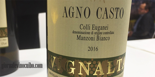 Vignalta Colli Euganei Agno Casto Manzoni 2016 Solare, luminoso. Il corredo olfattivo riporta profumi floreali di gelsomino e gardenia, di frutta a polpa bianca, note speziate di zafferano e limone. Morbido e cremoso all’assaggio con una piacevolissima scia sapida nel rinfrescare il finale.