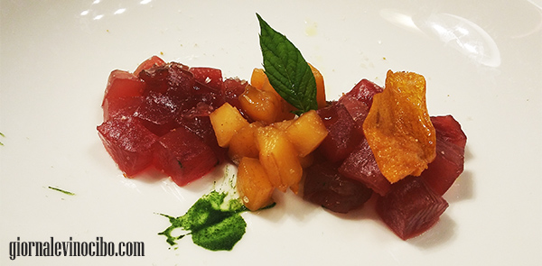 ISaor di sgombro con una julienne di cipolla al vino rosso e fagiolini, è il piatto meno sorprendente per equilibrio ed omogeneità, resta tuttavia estremamente godibile.