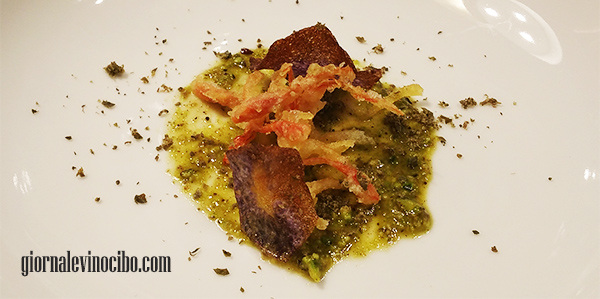 Iniziamo con una deliziosa entrè, le zampette di gambero con pesto al pistacchio, chips di patata viola e spolverata di cappero, piatto dai sapori articolati, equilibrato nel suo insieme e ideale per stuzzicare il palato.