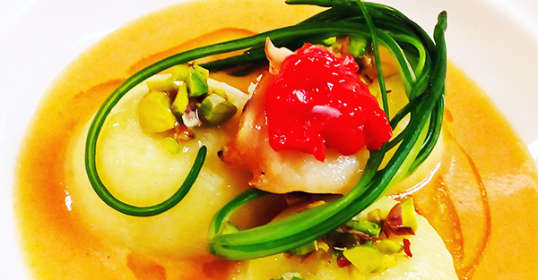 Sta già avendo successo, Ravioli di patate farciti con caprino fresco, cosparsi di granella di pistacchio serviti nella minestra di granchio rosa e accompagnati dalla salicornia: un piatto pulito, sobrio, ricco di gusto e di contrasti.