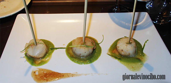 “Capesante al martini dry” (capesante, martini dry, crema di piselli, zeste di lime).