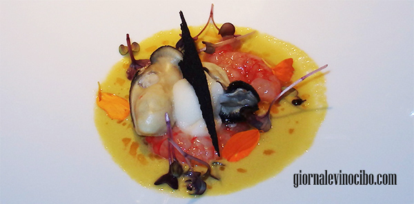 “Poco ma buono” (gazpacho, gambero rosso, ostriche e granita zenzero e lime).