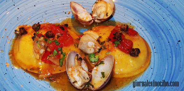 “Guarda che panciotto! (panciotti di capesante e gambero, con vongole, pomodoro e capperi croccanti). Ancora un piatto molto ghiotto, ma di grande equilibrio gustativo, tra le tendenze dolci e la salinità dei capperi. Si è sposato magnificamente con il Sinfonia di Grillo, vino di buona freschezza e di grande sapidità, struttura e persistenza; si è abbinato ottimamente ad un piatto complesso come questo, con la massima soddisfazione dell’ospite.
