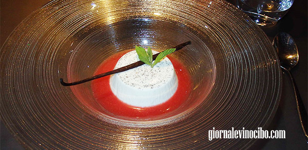 Panna cotta, vaniglia, menta e riduzione di fragole.