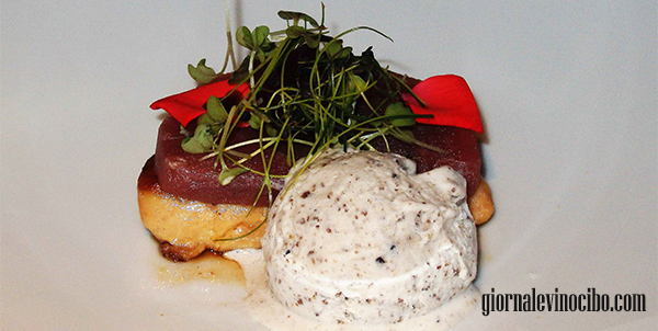 “Contrasto” (tonno rosso, foie gras, gelato al tartufo e riduzione di salsa di soia e worcester).
