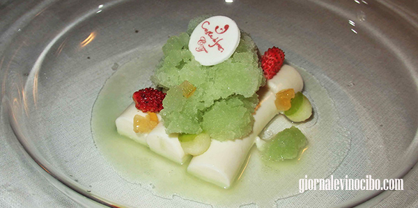 Carta Bianca (Bianco mangiare alle mandorle autoctone di Sicilia, sorbetto di mela verde e zeste di limone candito) Simile al dolce presente nella degustazione provata lo scorso anno, ha perso l’amarena, ma ha guadagnato nel gusto di mandorla, mi è parso più equilibrato, rimanendo una preparazione delicatamente raffinata. Molto buono.