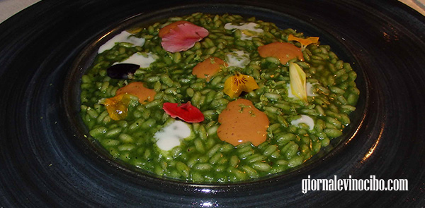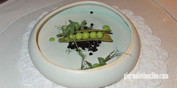 Il Finto baccello di piselli, cracker con all’interno piselli sotto forma di mousse ricomposti nella loro forma originale, posti su finto terriccio preparato con tartare di olive nere e con i germogli della pianta intorno. Al gusto sa essenzialmente di piselli, alla vista è straordinario, complimenti per la tecnica ma anche per l’idea. Capolavoro.