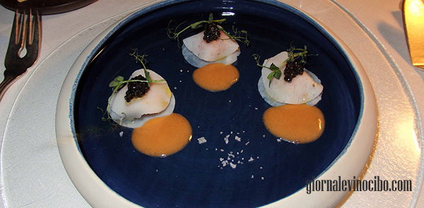 Raviolo di seppia (Seppia, cuore di gambero rosso, la sua bisque, caviale Calvisius e scaglie di sale di Petralia). Piatto perfettamente armonico e aromatico, dove si incrociano tendenze grasse dolci e saline in bell’equilibrio. Eccellente.