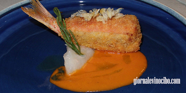 Triglia a beccafico (Triglia con crudo di scampo, asparago di mare e ristretto di datterino) Anche questa proposta fa parte delle rivisitazioni della tradizione; qua però il gusto è molto più lontano dall’originale rispetto alla portata precedente; tuttavia l’esito è ancora ottimo, anche per lo scontro tra diverse consistente, con la bella croccantezza della panatura in evidenza.