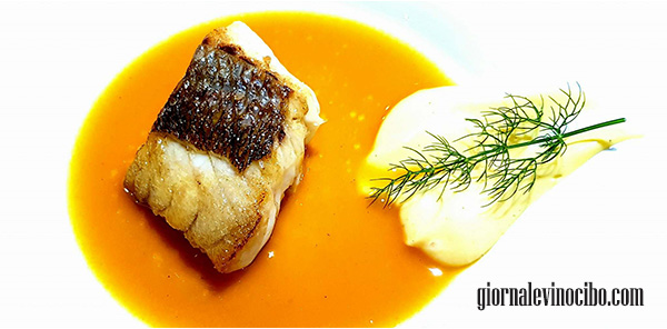 Segue Damiano Nigro dello stellato Villa D’Amelia a Benevello (Cn). Filetto di dentice arrosto con salsa olandese e bouillabaisse. Piatto a sensazioni tonde: dolcezza, grassezza, acidità e aromaticità. Sorprendente.
