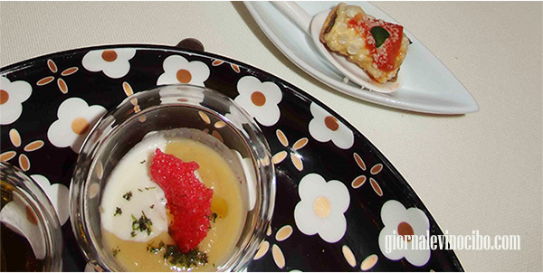 – Amuse bouche (1 – Macco di fave, pecorino e chip di riso. 2 – Pasta soffiata con crema di melanzana, parmigiano e pomodoro. 3 – Sarda a beccafico in gel di agrumi e chips di riso). Bocconcini tutti piacevoli e graditi, tra essi risalta senz’altro il terzo: mirabile per fattura e presentazione, si apre alla bocca con sentori agrumati per poi espandersi col tradizionale gusto della sarda a beccafico, una miscela veramente mirabile e armonica. Meriterebbe addirittura di essere trasformato e rielaborato, senza tuttavia la perdita delle attuali caratteristiche, in una delle proposte alla carta. Notevole.
