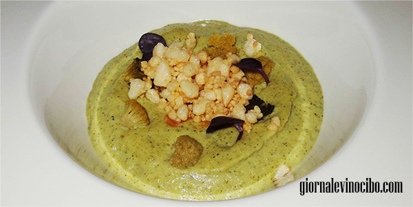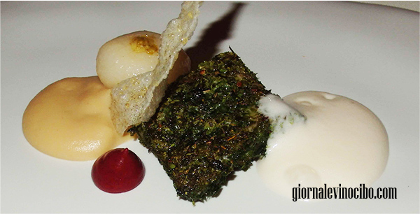 – Mediterraneo (spuma di broccolo servita su crema di cozze con cous cous soffiato e cavolfiore marinato in acqua frizzante, aceto, vino e lamponi). Altro piatto di bella composizione, dove tendenze dolci, acide e saline convivono in bella armonia, ravvivate da un attento confronto tra consistenze croccanti, tenere e cremose. Molto stuzzicante.