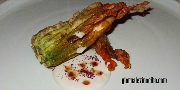 – Triglia in fiore (triglia, fiore di zucca, acciuga, bufala con crema di cocco e colatura di alici). Altro gran bel piatto, ancora un bell’equilibrio di consistenze, un incontrarsi e scontrarsi di aromi e saporosità differenti che si fondono in modo armonico.