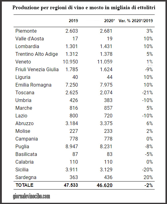 La vendemmia 2020 in Italia è stata caratterizzata da ottima qualità e da una riduzione di quantità, una raccolta molto promettente anche per il futuro commerciale del principale produttore mondiale di vino al mondo. Il responso definitivo della vendemmia italiana 2020, elaborato da Assoenologi, Ismea e Unione Italiana Vini, rileva una produzione complessiva di vino e mosto di 46,6 milioni di ettolitri, con una flessione del 2% rispetto ai 47,5 milioni di ettolitri del 2019.