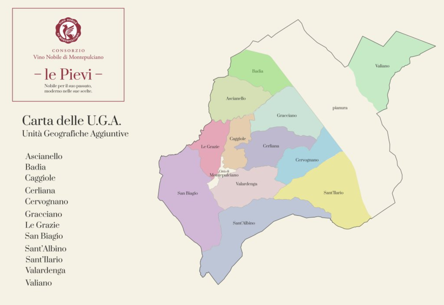 Lo studio storico della geologia e della geografia del territorio ha portato alla individuazione di 12 Unità geografiche aggiuntive (Cervognano, Cerliana, Caggiole, S. Albino, Valiano, Ascianello, San Biagio, Le Grazie, Gracciano, Badia, Argiano, Valardegna) definite nel disciplinare di produzione UGA (Unità geografiche aggiuntive), con la menzione “Pieve” in etichetta, le antiche Pievi, infatti, segnavano e dividevano il territorio già dall’epoca tardo romana e longobarda.